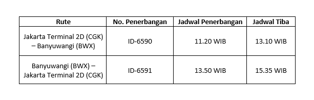 “Penerbangan ini berangkat dari Terminal 2D Bandara Internasional Soekarno-Hatta, Tangerang (CGK) menuju Bandara Banyuwangi (BWX). Penerbangan ini akan dilayani pulang pergi (PP),” kata Danang.