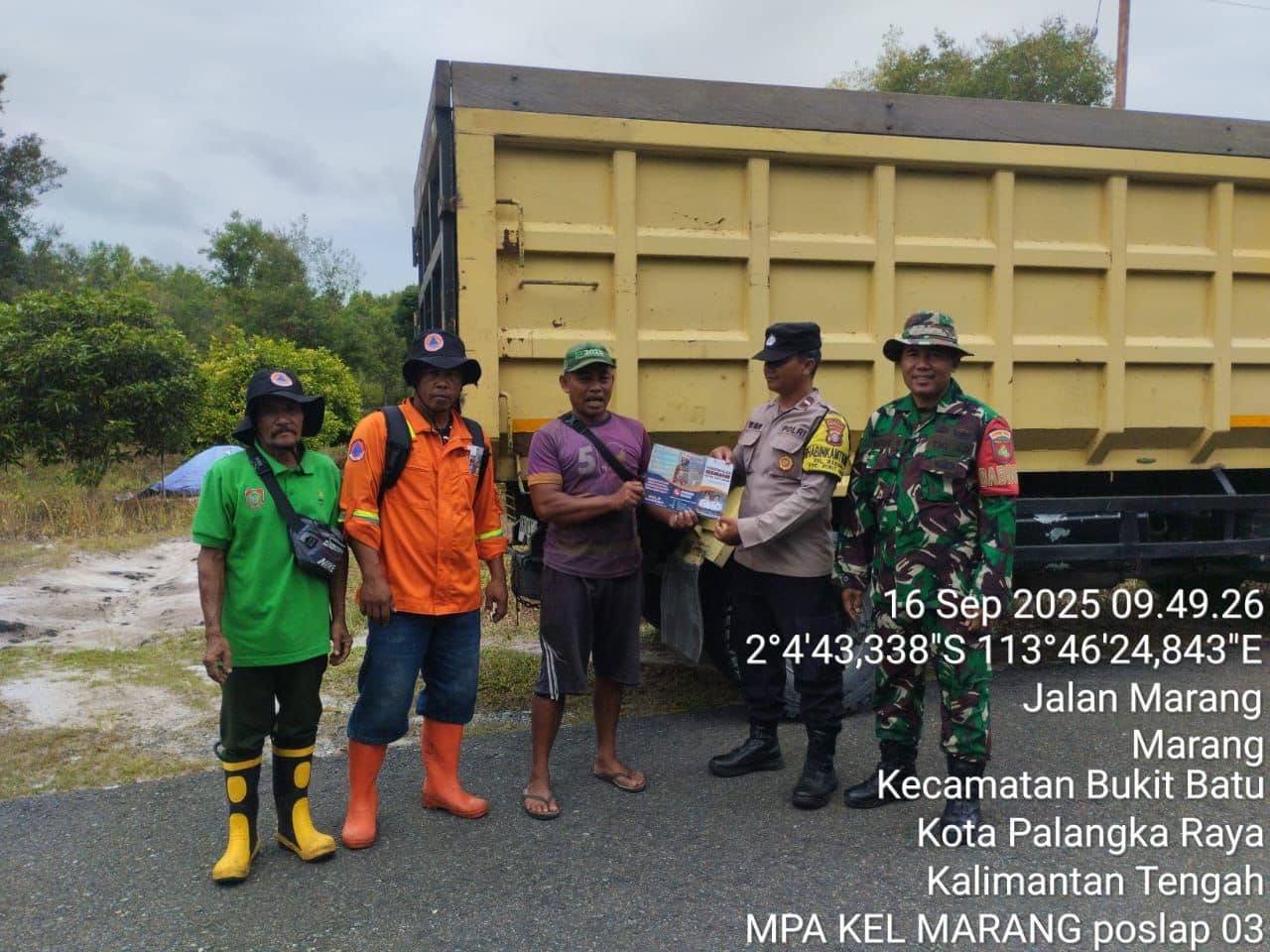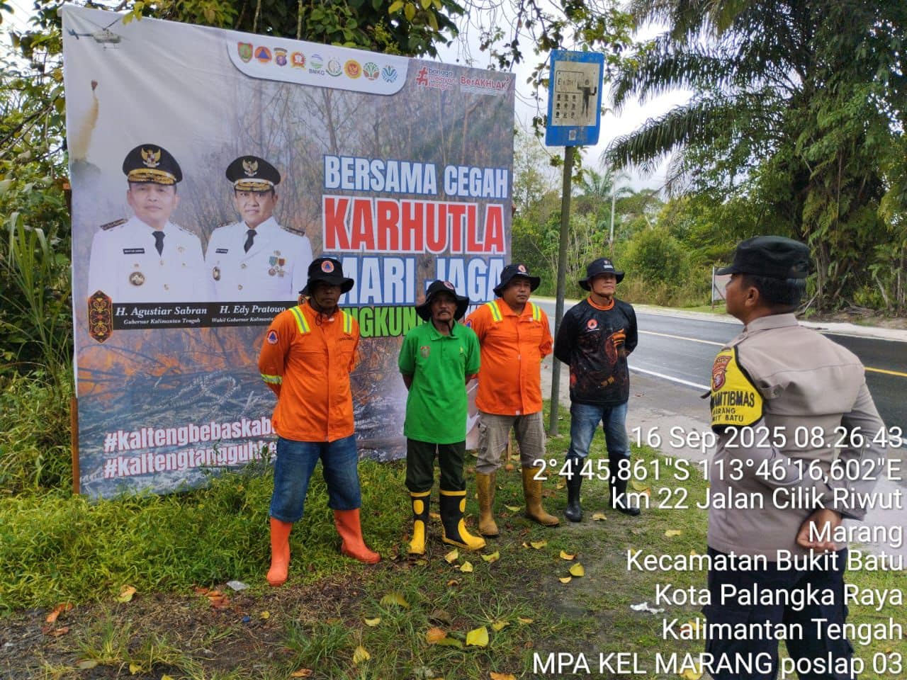Pada Selasa (16/9/2025), personel Polsek Bukit Batu bersama Tim Serbu Api Kelurahan (TSAK) dan Masyarakat Peduli Api (MPA) melaksanakan patroli pencegahan Karhutla di Posko Lap 03, Jalan Tjilik Riwut Km 22,5, Kelurahan Marang, Kecamatan Bukit Batu, Kota Palangka Raya.